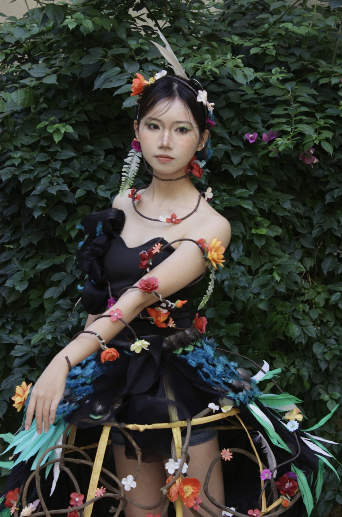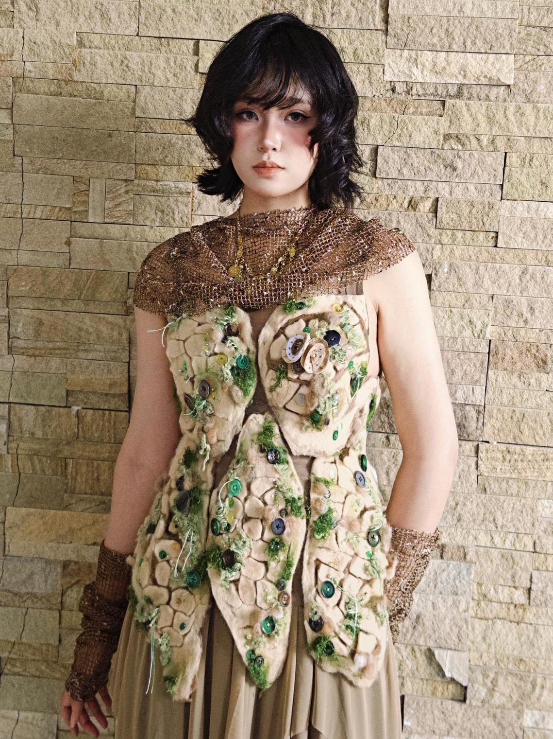 本次项目主题多元,视野开阔。同学们从传统文化、社会议题、未来科技、生态自然等维度汲取灵感,创作出一系列兼具思想性与视觉冲击力的作品。有从本土文化中提取元素,实现传统纹样与未来材质的对话;有受《沙丘》废土美学启发,以解构剪裁、做旧工艺与多层次编织,演绎末日语境下的古典与荒芜;还有聚焦海洋污染,用回收材料再造面料,表达可持续时尚的深刻思考。