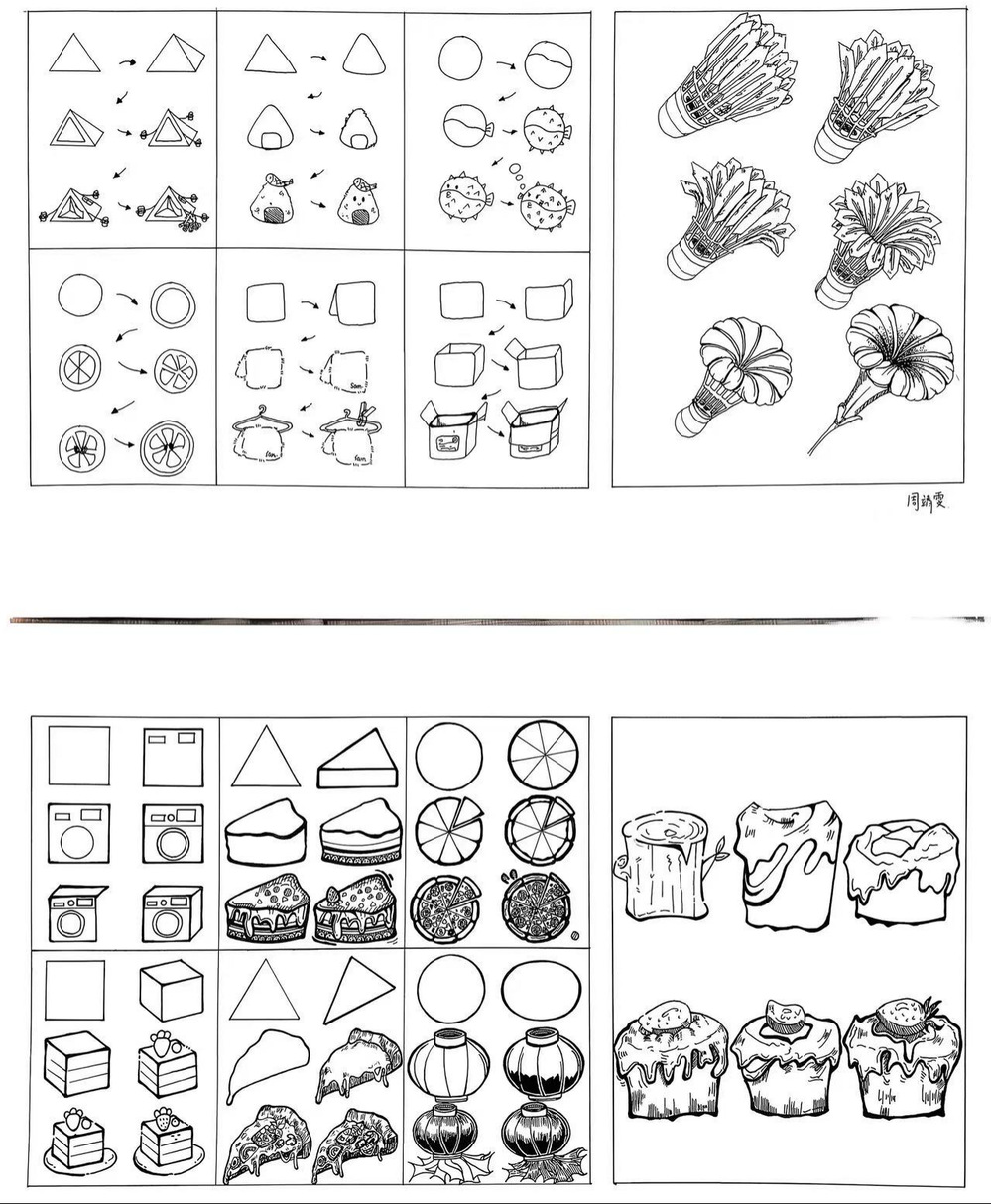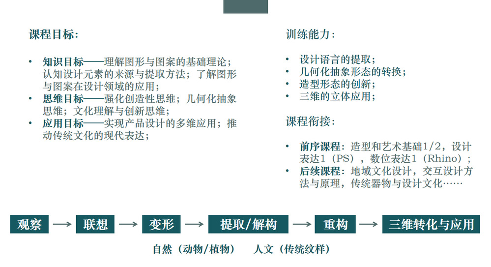 课程紧扣“观察-联想-变形-提取/解构-重构-三维转化与应用” 的核心逻辑,为学生搭建起循序渐进的思维训练体系。