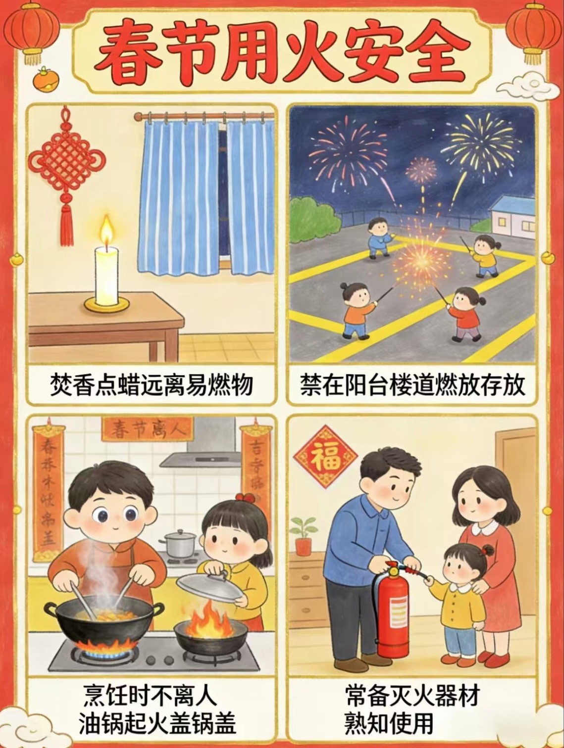 居家期间牢记“三清三关”:清走道、清阳台、清厨房;关火源、关气源、关电源。规范使用燃气与电器,保持通风,严防一氧化碳中毒;电动车不进楼、不入户、不飞线充电,杜绝火灾隐患。教育孩子不玩火、不玩电,远离易燃易爆物品,文明祭祀,严控明火。