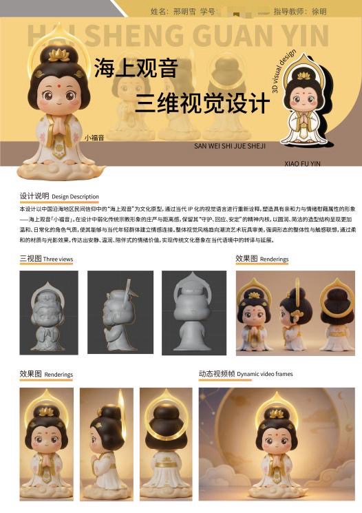 课程期末,学生们以个人形式提交了最终设计项目。成果丰富多样,充分展现了视觉传达专业特色与三维技术的融合:有的学生依据自己毕业设计选题传作了系列化、具有海南地域文化特色的三维动态图标与IP形象;有的同学打造了未来感十足的概念产品及其虚拟宣传短片;还有的同学构建了沉浸式的品牌故事场景或抽象的艺术化视觉短片。这些作品不仅技术完成度较高,更在创意概念、视觉审美、叙事表达上展现出成熟的专业素养。