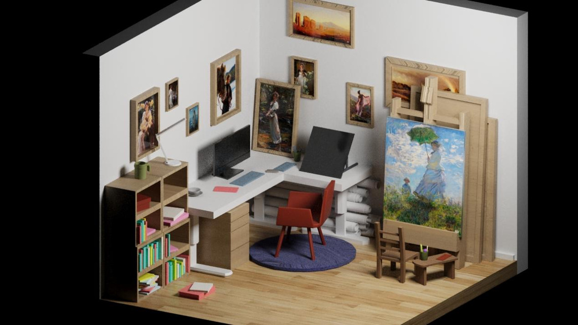 “以前觉得建模只是简单的搭建场景,现在才知道,每一个场景都在讲故事。”陈桄澔这样描述他在《三维动画建模与场景设计》课程中的转变。在为期三个月的学习中,他从最基础的多边形建模起步,在教师一对一指导下,逐步完成了从单一道具到复杂场景的创作。他创作的《画家小屋》场景作品,不仅结构细腻、光影层次丰富,更在场景布局中融入了叙事线索,获得课程评优,并成功收录于多家项目资源库。