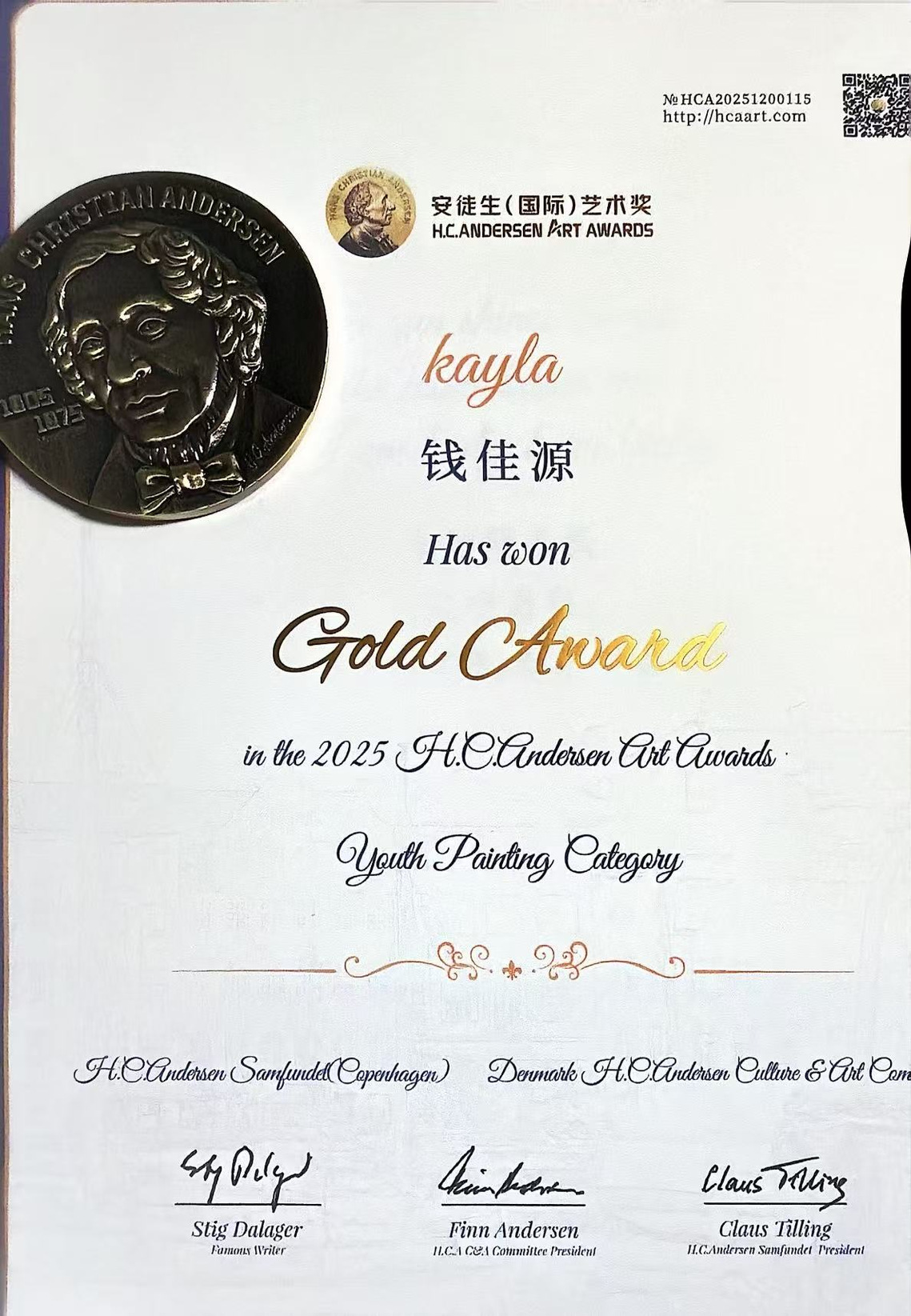 H.C.安徒生艺术奖由丹麦王国安徒生文化艺术发展委员会与丹麦欧登塞安徒生博物馆联合创立,是为纪念安徒生在文化与艺术领域的成就而设立的高级别国际艺术奖项,在全球艺术领域具有广泛影响力。该奖项面向全世界艺术爱好者,开设儿童组、青年组评选,旨在通过安徒生童话的影响力,鼓励优秀艺术作品创作,发掘未来艺术家,获奖者将被授予安徒生文化艺术奖章及荣誉证书,并有机会参与国际艺术展与文化交流活动。本次青年绘画类评选吸引了全球众多青年艺术爱好者参与,经过执委会专家多轮严格评审,最终评选出各类别奖项,竞争尤为激烈。