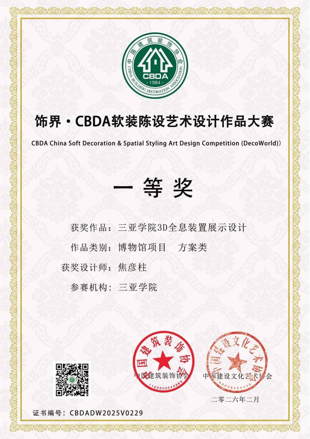 近日,2026年度饰界·CBDA软装陈设艺术设计作品大赛评选结果正式揭晓,三亚学院焦彦柱设计师的三亚学院3D全息装置展示设计作品,凭借极具创新性的设计理念与落地性的方案构思,荣获博物馆项目方案类一等奖。