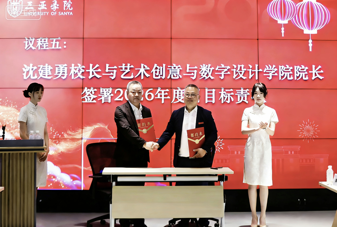 为落实吉利教育全面数字化结构转型发展战略,实现让大学坐在AI上,助力学生更好走向社会的教育思想,积极响应国家四新学科建设要求,三亚学院在初春伊始万物始发的季节,整合艺术、音乐、传媒、时尚、智能技术等优势教育资源,正式成立艺术创意与数字设计学院。2026年3月27日,校长沈建勇与学院院长陈博共同为新学院揭牌。执行校长王丹代表学校对艺术创意与数字设计学院做工作部署与深情寄语。学校领导班子、学校各部门领导、原学院管理团队、师生代表共同见证这一重要时刻。