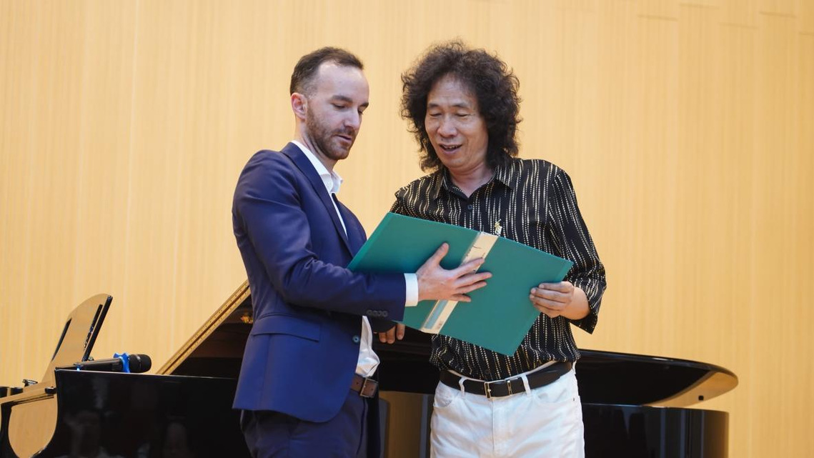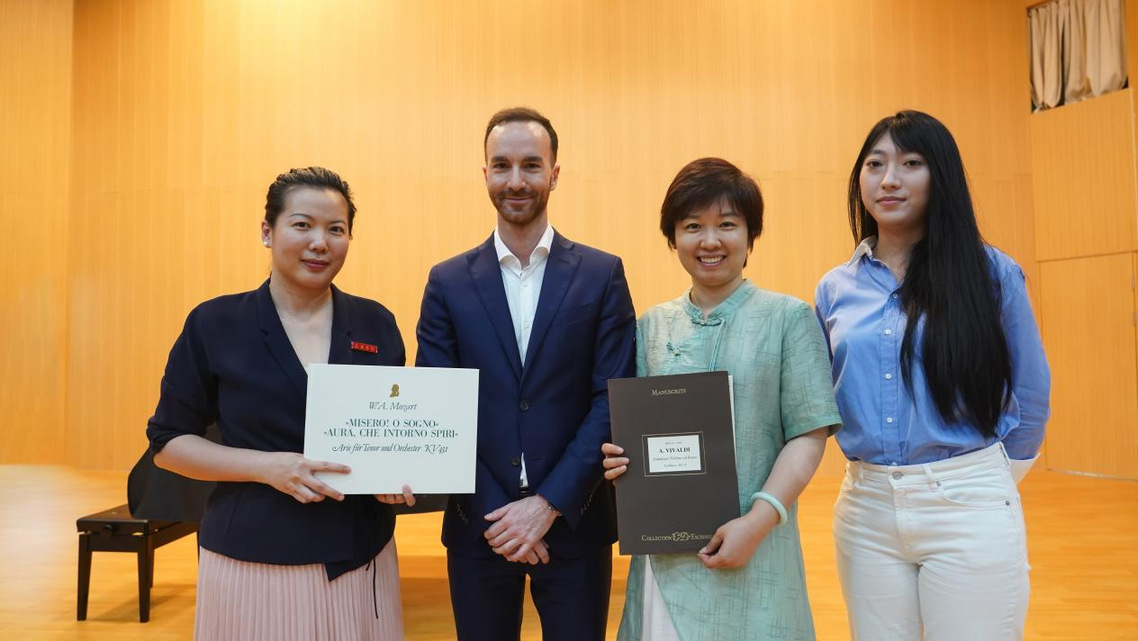 Davide Perniceni先生为艺术创意与数字设计学院送上了一份满载艺术分量与跨洋心意的礼物:维瓦尔第经典室内乐作品《小提琴与巴松管奏鸣曲》,与莫扎特传世声乐作品《男高音与管弦乐宣叙调与咏叹调》KV 431。这份跨越山海的音乐馈赠,既是对本次“东西方音乐对话”的美好呼应,也为学院的艺术教学、学科建设留下了珍贵的专业典藏与深厚助力。