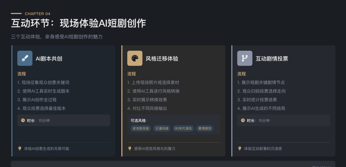 在讲座互动环节,初老师创新采用“AI剧本共创”形式,邀请学生现场输入关键词,借助大模型即时生成短剧脚本片段。大家围绕“文化冲突→和解”主线调整提示词,亲历从创意到微叙事的快速迭代,在人与AI的协作中直观理解跨文化叙事的生成逻辑与优化路径。